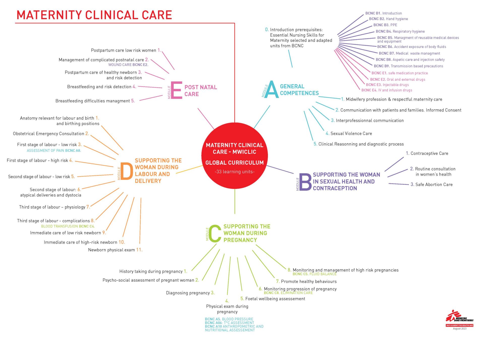 The Maternity Clinical Care curriculum is a global curriculum composed of five independent modules. They are linked together to offer different curriculums adapted to the needs of midwives and maternity staff learners according to the competencies involved in their daily work (depending on the context it can also be offered to clinical officers, maternity nurses or midwife assistants). The curriculum consists of 33 units grouped into the five modules: